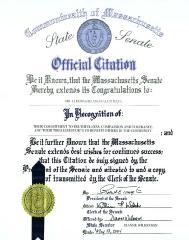 麻州参议院献上最美好的祝愿,祝不断取得成功。此褒奖状由参议院主席签署并由参议院秘书作证明和传递。