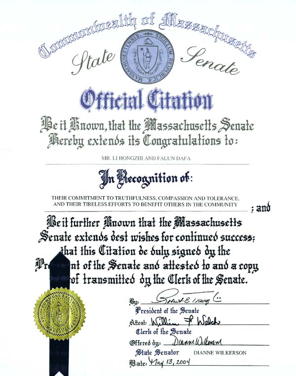 特此公告:马萨诸塞州参议院祝贺李洪志先生和法轮大法!