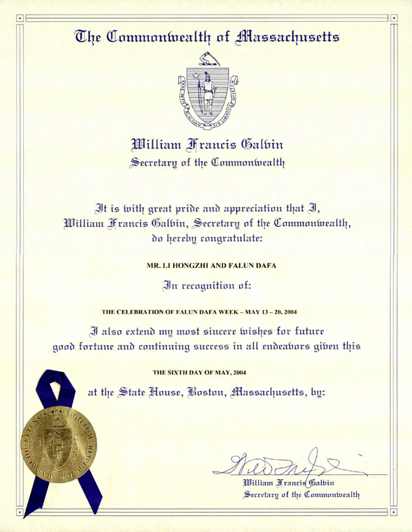 2004年5月6日于马萨诸塞州州府大楼,波士顿市签发者: 威廉-弗朗西斯-阁尔文(William Francis Galvin)麻州州务卿