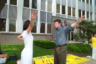 5月16日,星期天,“汽车之旅”抵达新墨西哥州和当地法轮功学员在新墨西哥州最大的城市Albuquerque的市政广场前,向人们展示宁静优美的法轮功功法,并真人模拟了法轮功学员在中国大陆遭受酷刑迫害的情景。该市2个主流媒体NBC和CBS到现场采访。一些过往的路人现场学功,还询问了炼功点的情况。