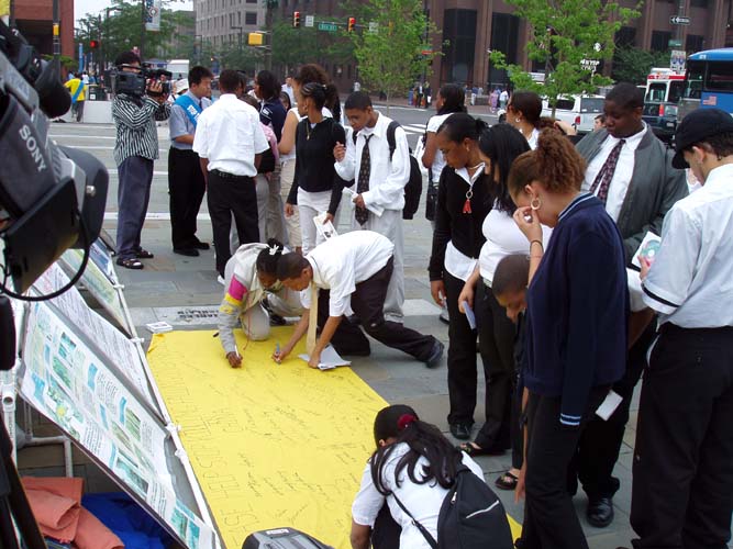 展板前的地上,铺了一大张签名纸张,过往的行人在听到了法轮功被迫害和江泽民的犯罪行径后,纷纷俯下身来签名。路过这里的Cherri Barron 和女儿Sydnuy在展布上签了字。她说:“这是自由的象征地。”