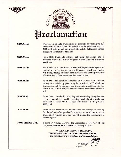 鉴于,鉴于法轮大法修炼者将在2004年5月13日欢庆法轮大法洪传世界12周年纪念日,并在五月份在全加拿大举办公众节日庆祝活动;并且