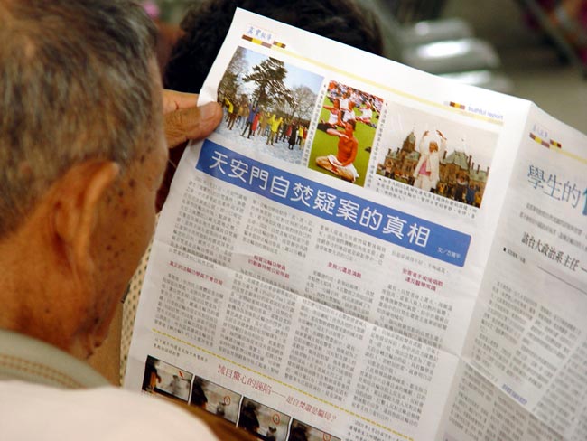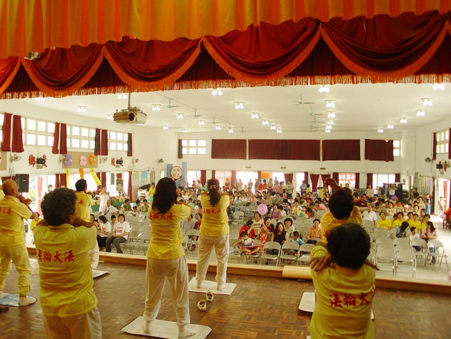 ![]() 学员演炼第四套功法 | ![]() 民众专心的看自焚伪案真象 | ![]() 学员于活动入口处发法轮功真象材料 |