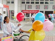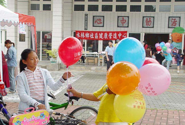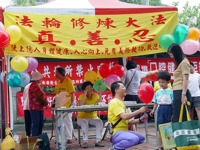 这次活动中还给法轮功学员一个摊位,让学员们展示法轮功的修炼心得报章供民众免费索取,并分发印有「法轮大法好、世界需要真善忍」的气球和书签给小朋友。