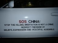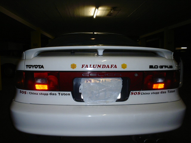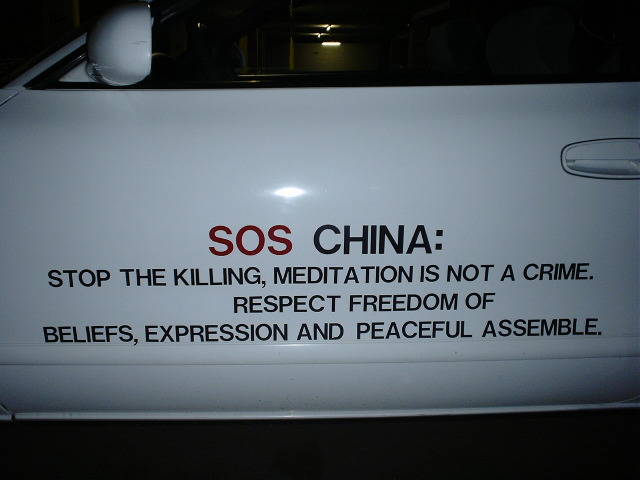 如照片所示,我们在汽车上贴了关于法轮功真象的图片和要求停止镇压的文字。公众的反应非常好。看了汽车上的信息后,很多人开始和我们谈法轮功遭受迫害真象的问题。