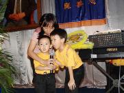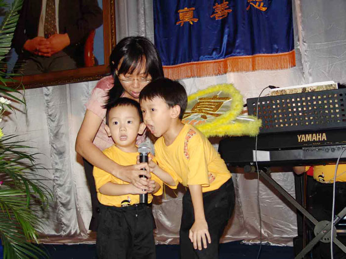 ![]() 全家得法。小哥哥弹电子琴,两位弟弟和妈妈唱歌赞颂大法 | ![]() 被布置得大方庄重的会场 | ![]() 合唱“法轮大法好” |
