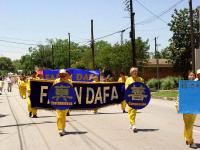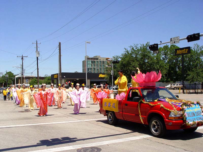 法轮功的团体是众人瞩目的焦点,成为游行队伍中一道亮丽的风景。手持“转法轮”书本模型的女学员走在最前面,后面三位学员分别手持“真”、“善”、“忍”的圆匾。在“法轮大法”的横幅之后,是法轮功学员的炼功队。面带祥和之色、身着金黄色炼功服的学员们,不时的停下来向观众展示优美的法轮功功法。被装扮一新的红色花车紧随其后。两名身着金黄色炼功服的学员站在车上,表演法轮功功法。