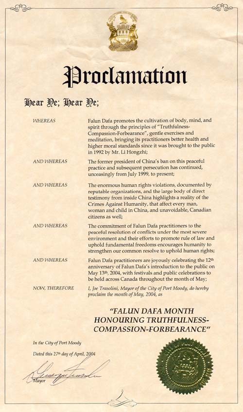鉴于,法轮大法学员们将于2004年5月13日喜庆法轮大法洪传12周年,并在5月期间在加拿大各地举行公开的庆祝活动;