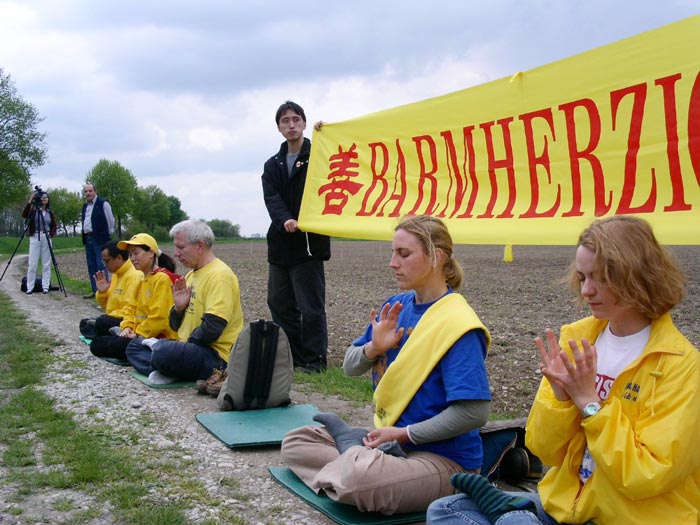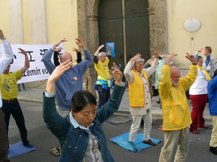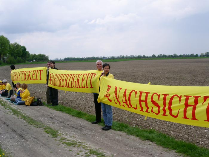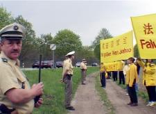 之后学员们也驱车回到了慕尼黑,继续和平请愿。一名德国安全部门的官员对学员说,当两年前江××访问柏林时,他也在柏林执行公务。当时德国政府相信了中国政府关于法轮功会干扰国事访问的谣言,但两年后的今天,他们谁都不再相信类似的谣言了。联邦德国刑警局近日承认其在2002年江××访德期间把法轮功学员从其下榻的柏林阿德隆酒店赶出的行为是违法的,并承认“法轮功学员针对在中国对法轮功的迫害的抗议活动,即使是向来自中国的国宾直接表达他们的这种抗议,也是属于德国宪法所规定的言论表达自由的保护范畴。” 德国法官也强调指出,法轮功一直是以和平方式进行抗争。在他知道的范围内,法轮功学员没有对任何人或物采用过暴力。