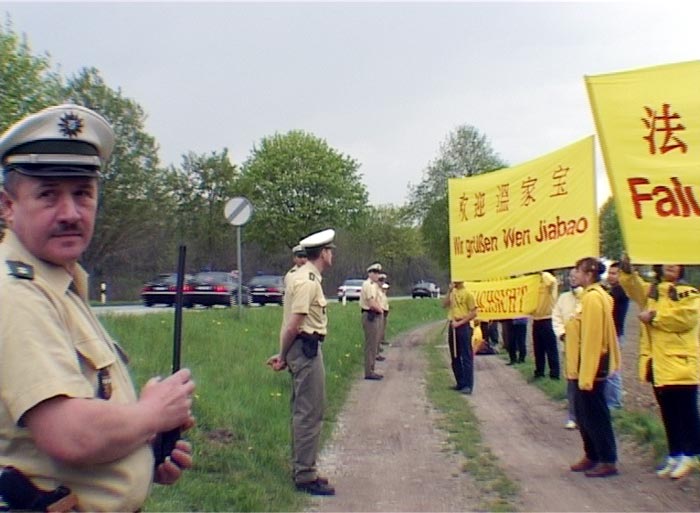 五月二日至六日温家宝访问德国,五月二日,来自德国及奥地利的法轮功学员在访问第一站慕尼黑及附近的城市弗莱辛(Freising)欢迎温家宝,呼吁严惩江××。