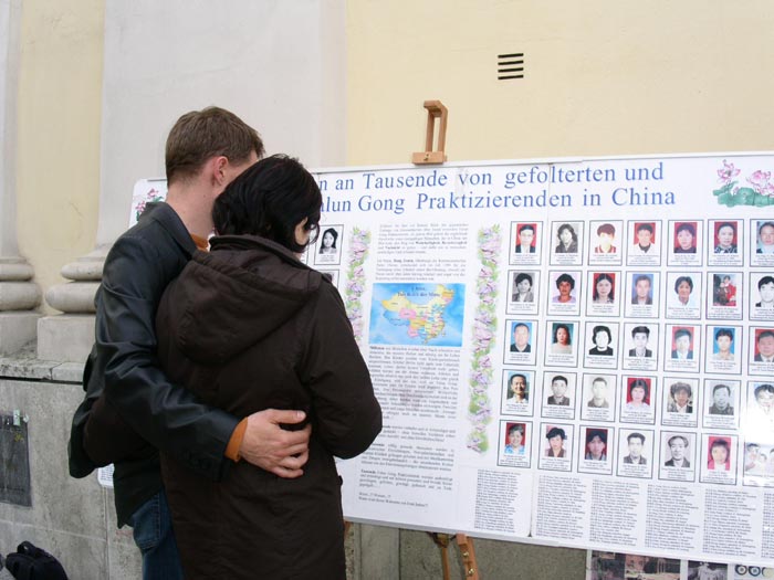 很多慕尼黑人以前已经知道了江氏的罪行。一名中年男子从学员手中接过传单,又询问了事情的因由,当学员谈到法轮功学员呼吁严惩江××时,还没等解释,他就说:“嗯,这就对了。我祝你们好运!”