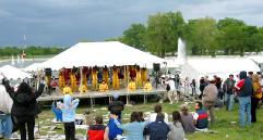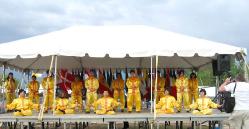 这次活动除了展棚外,还设有一个大舞台,表演各民族文化的代表节目,波兰、爱尔兰、日本、俄罗斯、泰国等等富有民族特色的演出博得了观众阵阵喝彩。法轮功学员也应邀上台做功法演示。随着悠扬的炼功音乐响起,“缓、慢、圆”的功法伴随着学员的解说:“我们是来自圣路易的法轮功学员,在这里给大家展示法轮功-能给你内心带来安宁的功法……”台下的观众显然被深深吸引,有人当场模仿着学员练了起来。