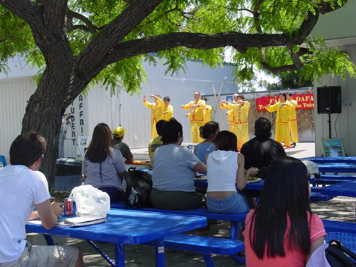 【明慧网2004年5月7日】2004年5月4日,加州圣地亚哥市的法轮功学员应邀在圣地亚哥市密沙大学(San Diego Mesa College)“美国亚太文化传统周”的庆祝活动中表演法轮大法功法。