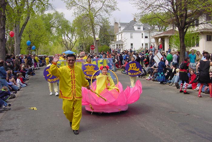 ![]() 法轮功学员的游行队伍 | ![]() 观众很高兴拿到法轮功的真象资料 | ![]() 莲花舞 |
