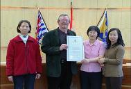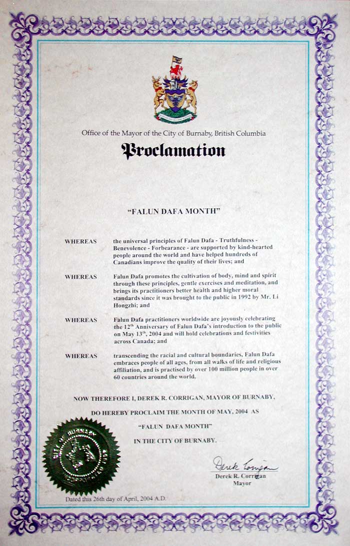 Corrigan市长说:“我祝你们好运,能在加拿大推广法轮大法。我认为在对于使人们生活协调,帮助人们有一个健康身心的健身方法中,法轮大法是一个很好的例子。你们把中国文化中最美好的部分带给了加拿大, 我希望你们能够成功的推广法轮大法。”