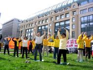 【明慧网2004年5月9日】2004年5月6日,法轮功学员来到欧盟中国贸易论坛所在地布鲁塞尔喜来登酒店外继续和平请愿,要求法办(法轮功的)凶手江××,薄熙来等。