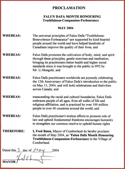 鉴于,全世界法轮大法学员将于2004年5月13日欢庆法轮大法洪传12周年,并在全加拿大举行庆祝活动;并且