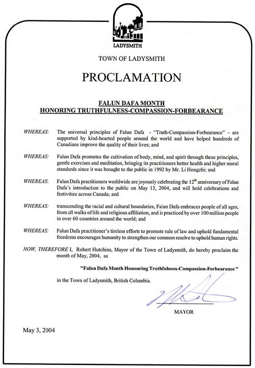 鉴此,我,罗伯特•哈钦斯(Robert Hutchins),莱迪史密斯镇(Town of Ladysmith)镇长,在此宣布2004年5月为莱迪史密斯镇
