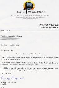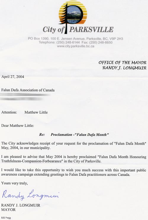 【明慧网2004年6月1日】2004年4月27日,加拿大不列颠哥伦比亚省帕克斯威尔市(City of Parksville)市长兰迪-龙米尔(Randy J. Longmuir) 致信加拿大法轮大法协会,褒奖5月为“法轮大法月”。信件如下: