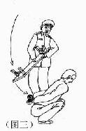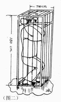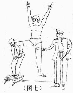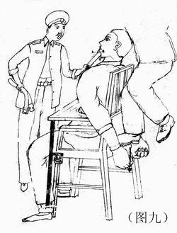 10. 强迫学员蹲在地上,双手背在背后,一动也不许动,时间一长,双腿酸痛难忍,每天从早晨5点蹲到半夜12点,有时至凌晨2点,学员稍有不从,立刻被以更残忍手段折磨(如图三)。所有不转化学员都被施此体罚,很多学员一连蹲了两个月。