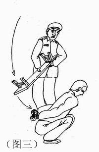 1. 强迫学员蹲在地上,手背在背后,犯人或警察用板凳猛击学员头部、背部。法轮功学员稍有不从,立即被以更残忍手段折磨。(如图三)大法弟子孙强等多人拒不服从,被拖进法轮功学员特别教育室用种种残忍手段折磨,闫继国、谭成军、于广和等多人被先后关进小号遭8名犯人毒打,后被铐到刑椅上用残忍手段折磨。