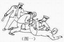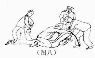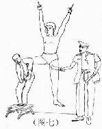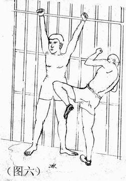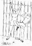 5. 把学员用铐子挂在床栏上或监栏上,用拳猛击胸部、腹部,用脚用力踹,或用膝盖猛力撞击,有的学员内脏被打坏,开始咳血。(如图六)大法弟子岳宝学和另一名双城弟子被挂在床栏上殴打十多天,岳宝学被铐子勒紧腕骨、剧痛难忍,导致两臂麻木,无知觉,手不能拿东西,几乎残废。