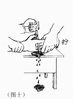 3. 把学员手指间插入硬物,然后握紧指端用力扭、压,或用拳猛砸,手指立刻被硌破,剧痛难忍。有的学员十指完全破损,血肉模糊,惨不忍睹。(如图十)