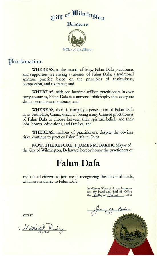 因此,我,特拉华州威明顿市市长詹姆斯-贝克(James M. Baker),在此褒奖法轮大法学员,并请所有的市民都和我一道认同法轮大法所提倡的这一普世价值。