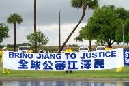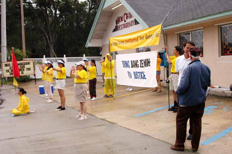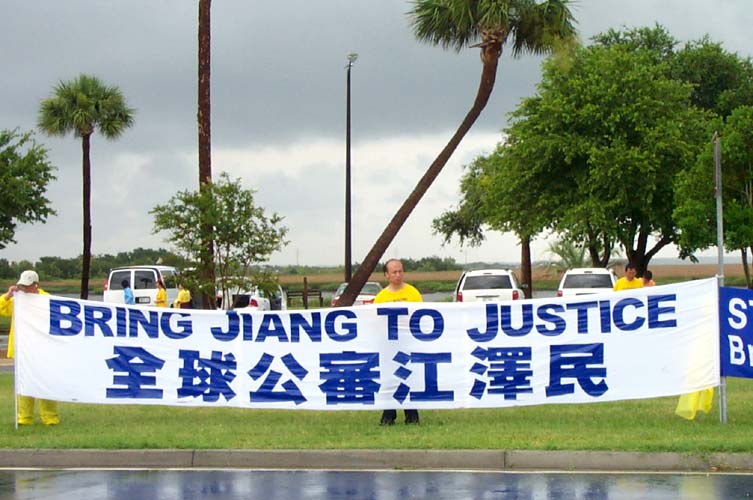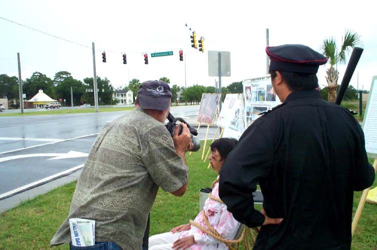 【明慧网2004年6月10日】(明慧记者林馨远报道)为期三天的八国峰会(G8)今天(2004年6月9日)继续在乔治亚州举行。为了让更多人们都来了解正发生的中国、已经持续了近五年的对法轮功学员的残酷迫害并帮助停止这场悲剧,来自美国各地的法轮功学员们继续在开会地点附近的布鲁斯维克市等地举办活动,向民众讲真象。天一直断断续续的下着雨,但学员们在雨中坚持炼功、打横幅、反酷刑展览。