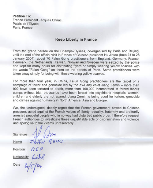 他在给大使的信中提到,“我作为一名法轮功之友,抗议你们1月24日在香榭丽大街无理拘捕并使用手铐来对待和平请愿的法轮功学员。这是屈于中国大使馆的压力。法国作为欧盟成员国被授予和平政治抗议基本权利。我发现这一屈从使所有示威的队伍被你们从游行的人群中隔离,我感到非常遗憾。我希望法国政府应象法轮功要求的那样,尽快向他们道歉”。