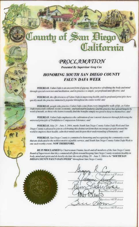 圣地亚哥郡管理委员会主席丹尼-加克比以及所有成员宣告:他们称颂所有促進圣地亚哥郡居民保持身、心、精神健康的努力,特此宣布2004年5月29日至6月5日为圣地亚哥郡的“南圣地亚哥郡法轮大法周”。