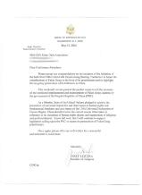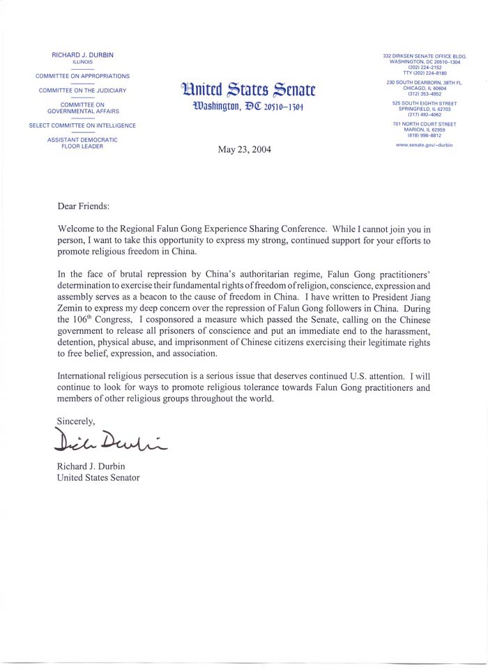 美国联邦参议员里查得.得本(Richard J. Durben)在贺信中表示:“面对来自中国高层决议的残酷迫害,法轮功学员们决定维护他们最基本的信仰权利和良知,象一座灯塔照亮了中国未来的自由。”他还说:“我已经致信中国前国家主席江泽民,表达了我对法轮功学员最深切的关心,呼吁中国大陆能够释放所有被关押的学员,立即停止对这些仅仅是维护正当合法的信仰自由和表达的中国公民的骚扰,劳教,肉体折磨和判刑。”在来信中最后得本先生表示还将继续关注并寻求办法帮助受迫害的法轮功学员。