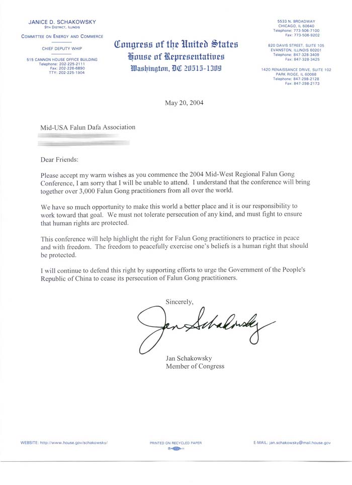 美国联邦众议员简.斯考斯凯(Jan Schakowsky) 的贺信。