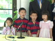 法会中,明慧学校的学生们上台表演,演唱了歌曲“法轮大法好”,并背颂了师父《洪吟》中的诗。