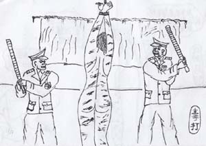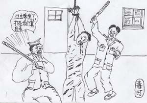 吊铐:这个行刑方式非常残酷,把学员双手用细绳绑住吊起,一吊几小时或几天。有的细绳崩断,有的勒入肉中,学员当场昏死过去。还有更多用手铐吊起,铐断筋骨。这种酷刑轻者手臂长时间不能活动,重者终身残废。