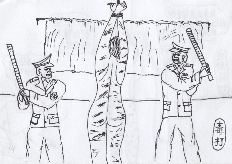 苏秦背剑:把人的双手臂背在后面用手铐铐住,恶警抓住铁链踩住学员后背,用力往上拽,痛苦至极。