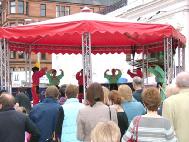 在展台旁,也是站满了人。许多人都已从报纸电视上得知爱丁堡军乐节邀请了迫害人权的江××领导的军队,一看到海报就主动过来签名表示反对。由于签名的人相当多,桌子前面挤不下,有的人跑到桌子另一边来签,围满了一圈。有位女士问:“孩子能不能签?”然后把她的一对儿女都叫来签字。短短几个小时,就征集到了四百多人的签名。