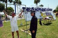 法轮功学员们在乔州萨瓦纳市中心的雷诺广场炼功。他们展示图片希望人们关注在中国的迫害。中国的法轮功学员因为他们的信仰而受到折磨,被关進监狱,有的被强迫做奴工。来自佛州的凯文-杜向萨瓦纳警察局的警官凯罗(Anthony Gallo)说明真象。