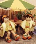 这样一个娃娃的包装程序如下:给娃娃穿上T恤衫、裤子,把腰带穿在外衣上,给娃娃穿上外衣,带好头箍,穿上鞋,从里到外把全部线头都要剪掉,把头发整理整齐,把穿好衣服的娃娃放在白颜色的布袋上,在娃娃的臀部下放上干燥剂,然后再套上透明塑料袋,再把纸盒折好,把这个包装完的娃娃放在纸盒里。这样才算完工。一个人一天的工作量是120个。