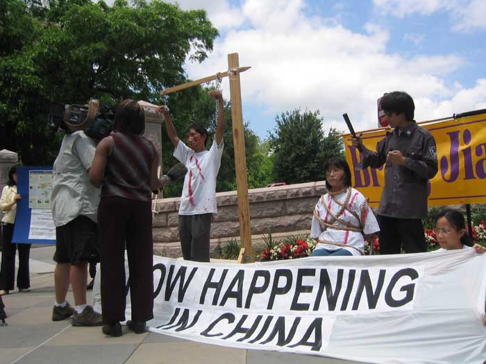 他们说,江酷刑折磨那些修炼法轮功的人们。法轮功是一种广受欢迎的包括打坐和动功的修炼。