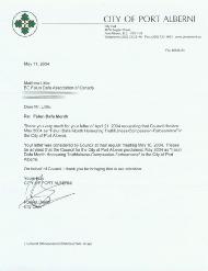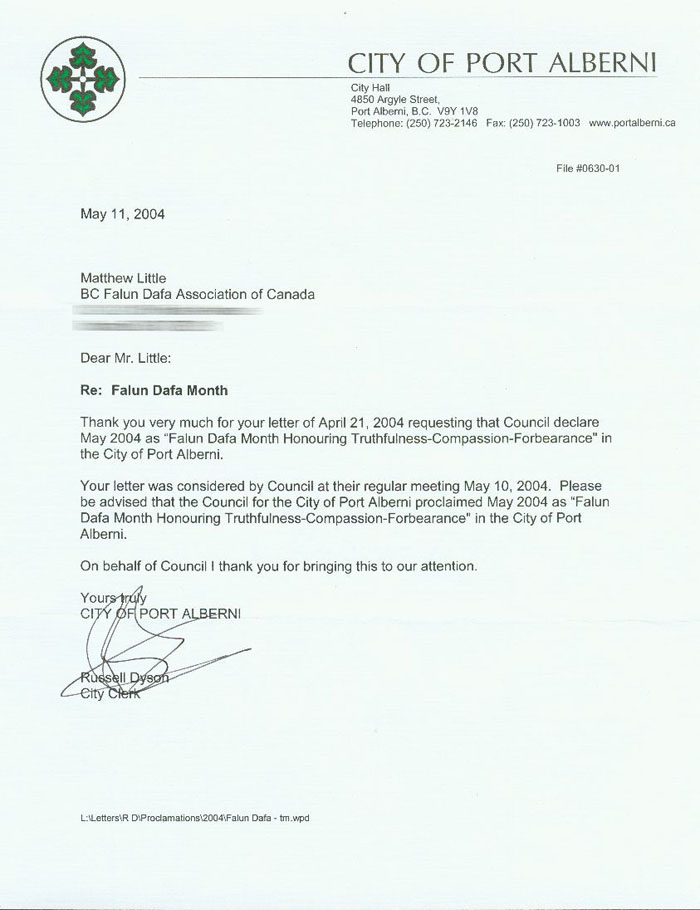 【明慧网2004年6月2日】2004年5月11日,加拿大不列颠哥伦比亚省帕特阿尔伯尼市(City of Port Alberni)市议会致信加拿大法轮大法协会,褒奖5月为“嘉奖真、善、忍的法轮大法月”。信件如下: