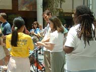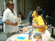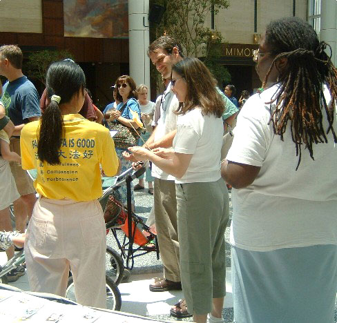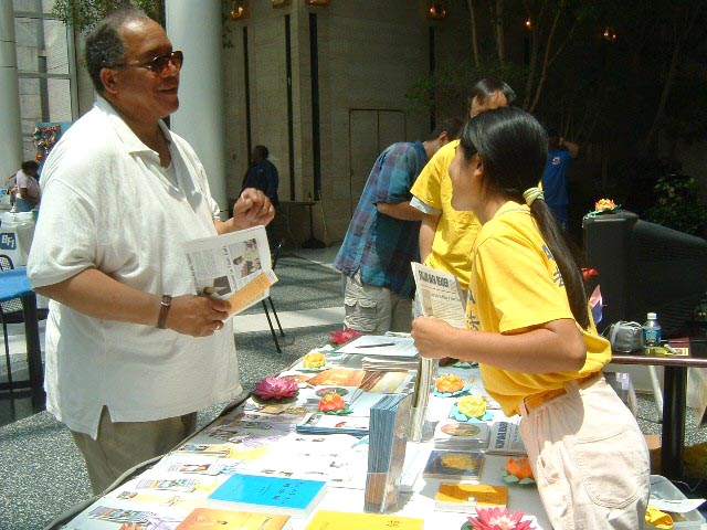 活动快结束时,来了一位黑人女士。她和学员乔安谈了好一会儿,乔安便与她一起读起了《转法轮》。读了两段,她俩忽然都激动得泪流满面。这位女士说自己是一位太极教师,每天的教课让她非常疲惫,她多么渴望能作一名学生,静静的倾听教诲。她上教堂,但是那些似乎入不了她的心。而今天乔安说的话句句打动人心,法轮功正是她所期盼的。她紧紧握着乔安送她的《转法轮》,“这就是我的精神食粮。不论我去哪里,我都要带上这本书,读这本书。”她激动的向碰到的人述说着今天的奇遇。