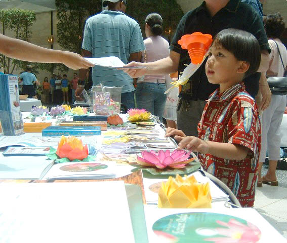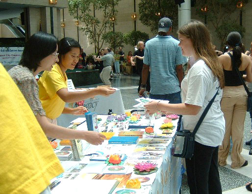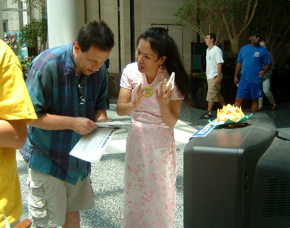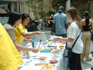 学员们用电视不停的反复播放法轮大法的简介,同时大家轮流几乎不间断的演示五套功法,展位上是大法书籍和教功录像带等资料,向市民们展示大法的美好;精致的纸莲花,绚丽多彩的荷花小风车也捎去大法弟子们的美好祝愿;同时在展位一侧利用学员的油画,张贴真象小海报,英文版人权报告等资料述说法轮功学员在中国大陆遭受的残酷迫害,并放上谴责迫害的征集签名表。