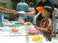 学员们还在布置展位,一个华人大家庭就笑容满面的走过来亲切的打招呼。老奶奶很喜欢纸莲花,她小声的跟女儿说,“好像是自己用手折的”。她女儿当即落落大方的问,“你们是自己做的吗?”学员笑着说,“阿姨,喜欢就拿一朵吧”。老奶奶不好意思的摆摆手。“妈,那些书签,你自己去挑一个吧。”她女儿给她鼓劲儿。学员亲切的递上一方洪法书签。“谢谢,谢谢。”老奶奶很高兴的收下了。