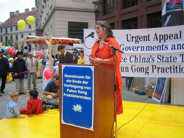 学员们通过向市民和游客讲真象、表演功法、展示酷刑展和演奏乐曲等呼吁全社会帮助停止对法轮功学员的迫害。奥地利国会人权委员会主席斯多尔西特到场演讲表示支持。
