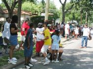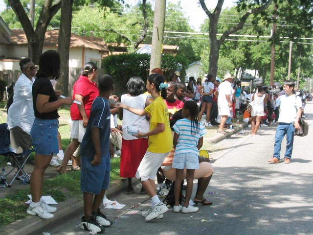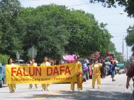 【明慧网2004年6月23日】2004年6月19日,在德州奥斯汀市举行了一年一度的Juneteenth大游行来庆祝和纪念1865年6月19日德州废除奴隶制,黑人得以自由。Juneteenth已经成为跨种族的庆祝“自由”的节日。近万名观众(几乎全是美国黑人)前来观看游行。奥斯汀法轮功团体是游行中唯一的东方团体,鲜艳的服装,美丽的花车,祥和的功法演示,深邃的内涵使得法轮功团体独具特色,引人注目。人们涌向发传单的学员要材料,有的站得远点拿不到的便大声喊住学员,有的紧赶几步追上学员要材料。有位警察要了材料后说要学法轮功,很愿意和学员合影。