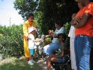有位六岁的小弟子从头到尾走过来,炎热的天气使得她的小脸红红的,这位小弟子的左边胳膊绑着绷带,一路上用右边胳膊专注的给人们发着材料,而她的姐姐为了向更多的人们散发材料,把原来装有食物的背包腾空,放上大法真象材料,只留了一瓶水在身上,这些孩子们的纯朴的心感动了许多观众。
