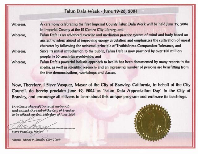 因此,现在,我,加利福尼亚州布劳利市市长史蒂夫-瓦斯库兹(Steve Vasquez),代表市议会特此宣布2004年6月19日为布劳利市“法轮大法赞赏日”,并且鼓励全体市民了解这一独特的功法和接受其教导。