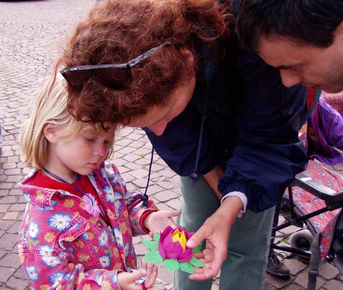 在舞台下,法轮功学员设置的展位上,摆满了具中国特色的装饰品和中国食品,观众们可以随意品尝中国茶和小吃。学员们向观众发放法轮功简介并教他们叠纸莲花,许多人饶有兴趣的学着做。