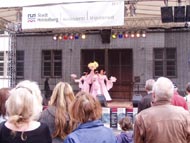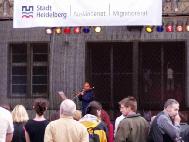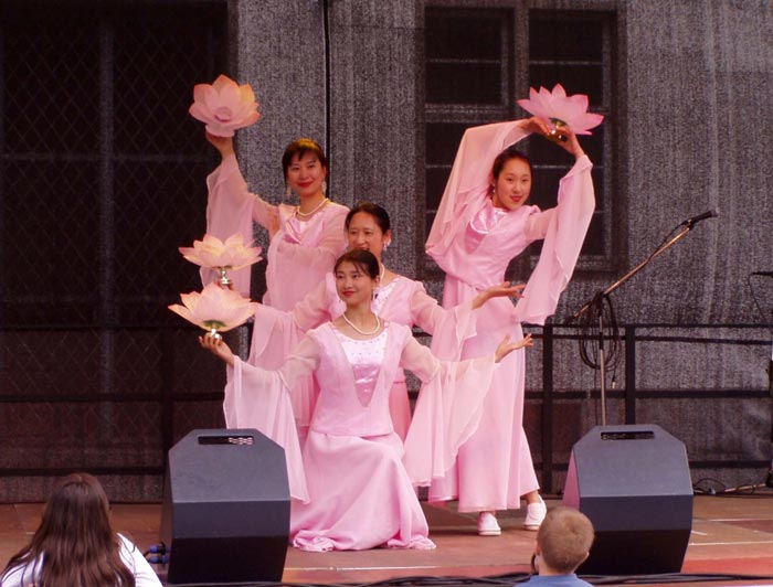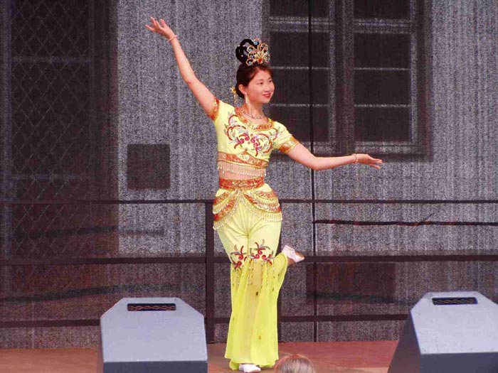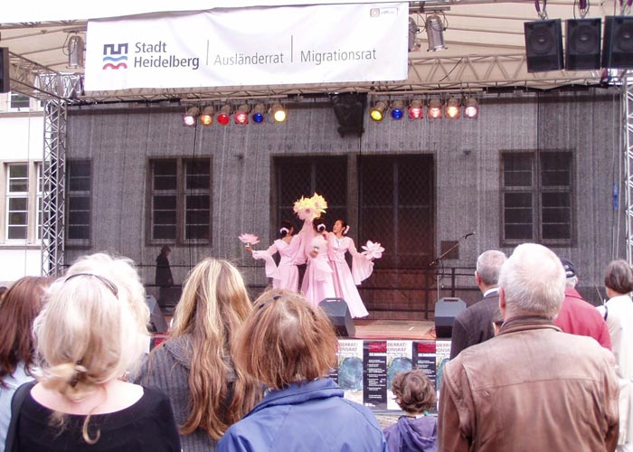 【明慧网2004年6月25日】二零零四年六月五日,在海德堡(Heidelberg)大学广场上一年一度的外国人文化节活动拉开了序幕。来自非洲、亚洲、拉丁美洲等地的旅德外国人表演了精彩的、来自不同文化背景的节目。应当地德中语言文化交流协会的邀请,来自德国南部地区的法轮功学员参加了这次活动。由法轮功学员组成的飞天舞蹈团在舞台上表演了彩带舞“敦煌”和她们的保留节目“莲花颂”。一位也是法轮功学员的笛子演奏家吹奏了富有中国特色的乐曲。另一位学员向大家简要介绍了法轮功以及在中国大陆发生的对法轮功学员的迫害